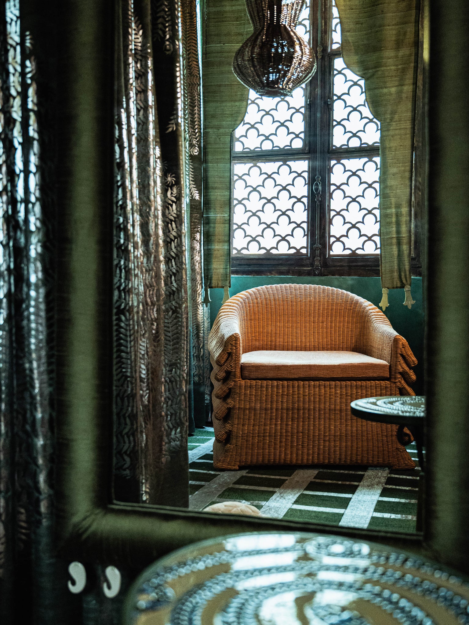 Made of Emerald Green Agave and Stainless Steel, the Treillage Rug draws inspiration from the wooden trellises of gardens and conservatories, reimagined for a contemporary interior. Originally imagined as part of a “Winter Garden” space, its design harmonizes with metallic elements, echoing the gold, brass, and silver finishes throughout the space. With its intricate pattern and reflective tones, the rug creates a dialogue between materials, bringing elegance, depth, and a touch of enchantment to any room.