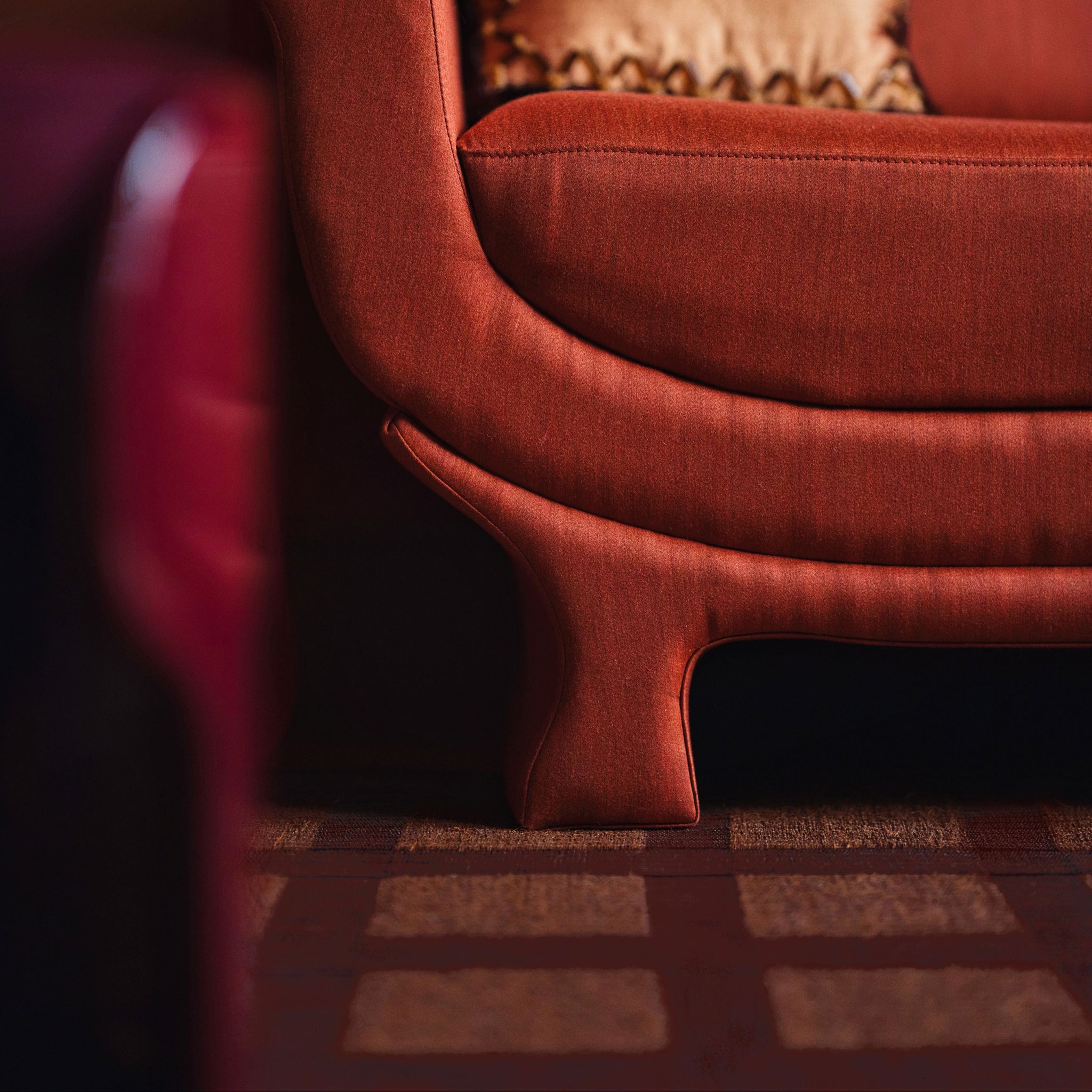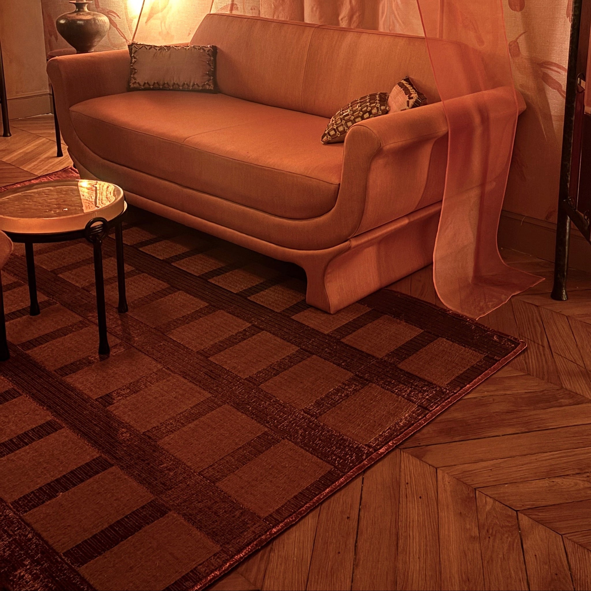 the Treillage Rug draws inspiration from the wooden trellises of gardens and conservatories, reimagined for a contemporary interior. Originally imagined as part of a “Winter Garden” space, its design harmonizes with metallic elements, echoing the gold, brass, and silver finishes throughout the space. With its intricate pattern and reflective tones, the rug creates a dialogue between materials, bringing elegance, depth, and a touch of enchantment to any room.